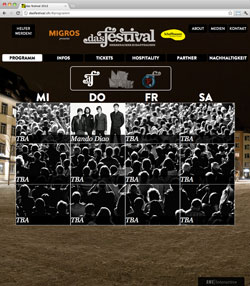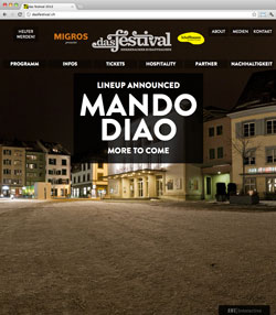 Februar 2012: Zahllose Openairs bieten uns Schweizern die Möglichkeit, wunderbare Umgebung, ausgelassene Stimmung und erstklassige Musik als Gesamtpaket zu geniessen – und schenken uns so unvergessliche Wochenenden. Schaffhausen zieht mit und serviert Musikliebhabern während vier Tagen Top-Bands auf dem wohl schönsten Platz der nördlichen Schweiz – dem Herrenacker. «das Festival» –Mitten in der Altstadt! Genau dieses Wahrzeichen haben wir in unserer online-Kommunikation ins Zentrum gerückt. Wo alle Informationen rund um «das Festival» vermittelt werden, erhalten «Neulinge» über den Panorama-Hintergrund eine kleine Vorschau unseres kleinen Paradieses – während «erfahrene Hasen» den Platz aus bester Perspektive betrachten können. «das Festival» ist ein einzigartiges Event in der Schweiz – so soll auch die Website ein einzigartiges Erlebnis für die zahlreichen Besucher bieten.